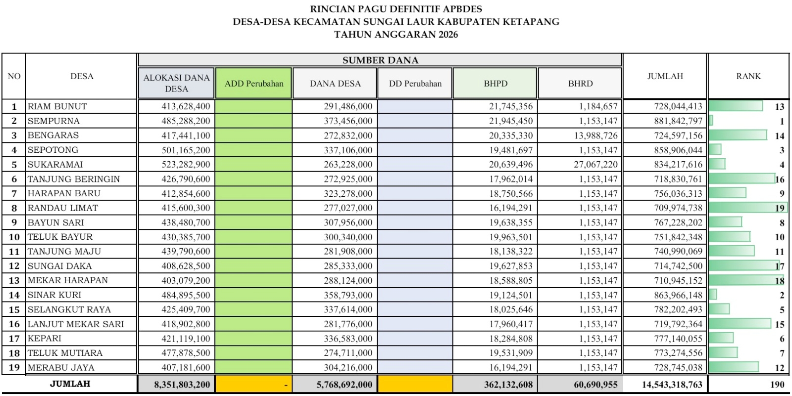 Rincian Pagu definitif APBDes Setiap Desa di Kecamatan Sungai Laur Tahun Anggaran 2026, Dengan Pagu setiap Desa berbeda-beda besar kecilnya.